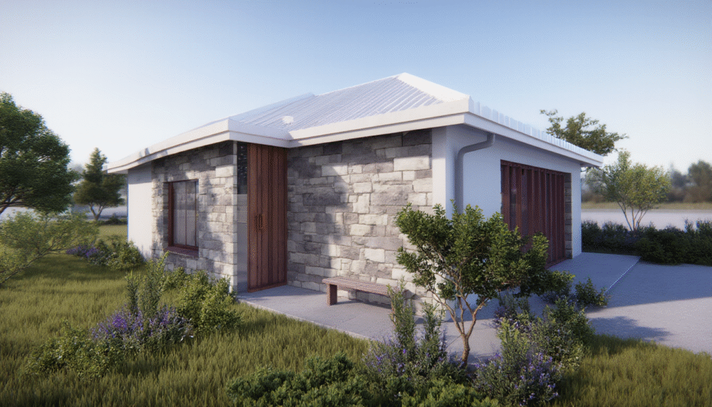 Exterior view: A combination of natural stone and wood on a plastered white background, under an elegant, slightly sloping metal roof.